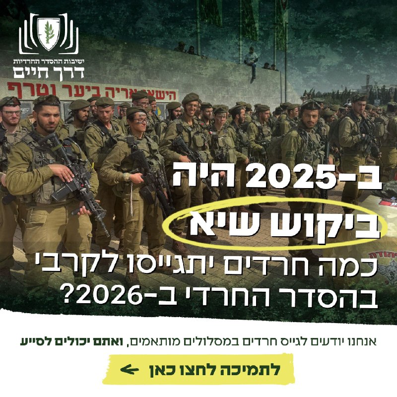תמכו עכשיו בישיבות "דרך חיים" כדי שעוד צעירים חרדים יוכלו להשתלב בצה"ל ובשוק העבודה >> https://causematch.com/ntvt_25/magal14/donate/